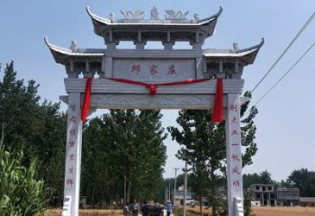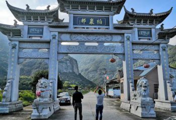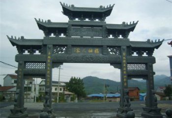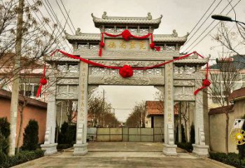新農村單門三樓花崗石雕門樓牌坊,是一種獨特的建筑風格,來源于中國傳統的文化建筑。它采用了花崗石雕刻的門樓牌坊,在中國古代的建筑中很常見,但也有許多新的設計。